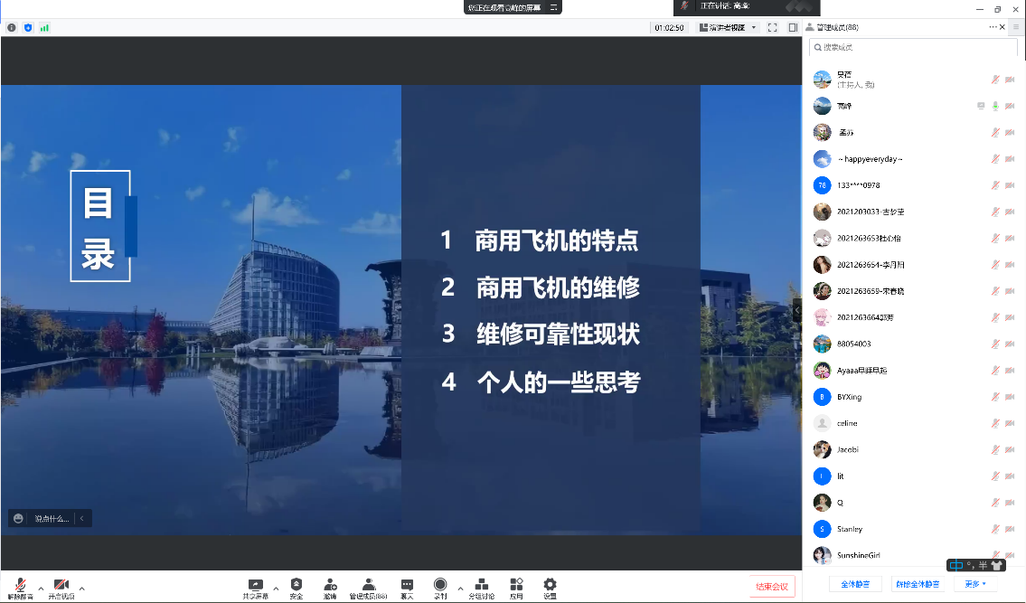报告分享结束后,高峰老师和线上师生就民用飞机维修存在的痛点问题、可靠性等未来进一步可研究的方向进行了深入交流。最后,吴蓓副教授对本次学术交流进行了简单总结。本次报告会为漫岛动漫 师生提供了一次重要的学习交流机会,为漫岛动漫 多个专业的师生提供了航空领域实践方面的视角,拓宽了研究思路。