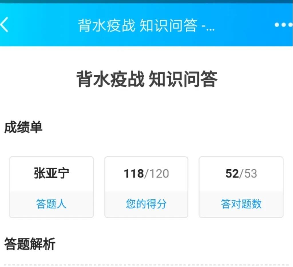 “背水‘疫’战”线上答题活动开展之后,支部成员积极参与答题,检验自身学习成果,在线上答题活动中取得优异成绩。
