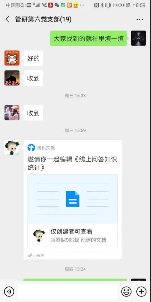 支部纪律委员张旭同学提出,他正在负责组织学院团委进行“背水‘疫’战”线上答题活动,正好将支部活动与其结合起来,进行一次党团合作。前期支部同学积极学习有关防疫知识,并进行具体知识点的总结,进行汇总形成防疫知识点资料库,为学院团委的线上答题题库提供参考。后期支部成员积极参与线上答题活动,也是检验自身学习成果的好机会。