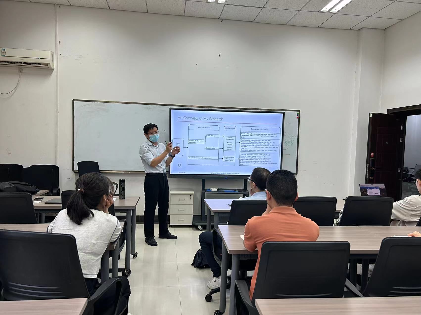 会议伊始,傅陈翼对汤勤深的个人情况、学术成果等进行了简要介绍,参会师生对汤勤深教授的来访表示了热烈欢迎。在此次报告会中,汤勤深介绍了共享车辆系统在需求、目的地、行程时间等不确定条件下的车辆调度问题,用熵风险度量方法构建了共享车辆的动态鲁棒优化模型,并将其重新表述为一般混合整数凸/线性优化模型,研究结果表明提出的熵鲁棒优化模型在平均服务水平和平均重新定位成本方面都优于基准模型。