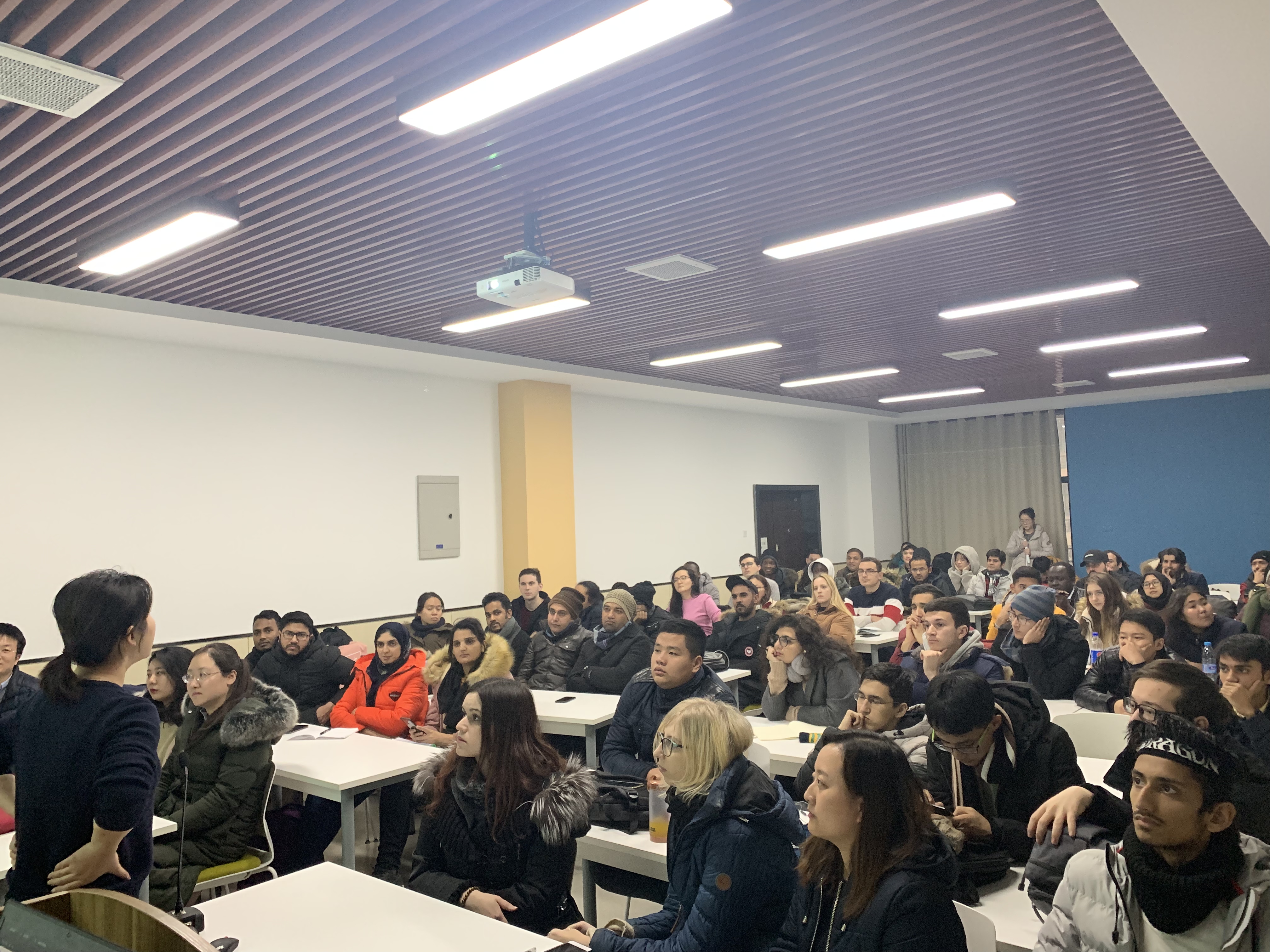210报告厅举办了留学生学术纪律说明会,说明会面向全体留学生,主要内容包括向硕博留学生同学们介绍毕业论文审核要求及注意事项,以及学院的考勤制度。参加说明会的老师有副院长贾明、英文留学生班主任邵婧、研究生教学秘书陈斐然和国际教育学院留学生辅导员姬老师、韩老师。说明会由外事秘书王霄主持。