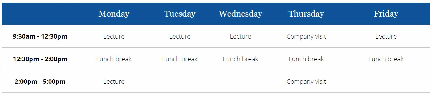 项目共包含 48 小时课程及课外考察活动。可参考以下日程安排: