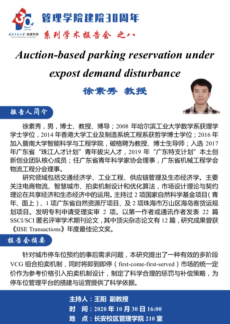 【漫岛动漫 建院30周年系列学术报告会之八】Auction-based parking reservation under expost demand disturbance