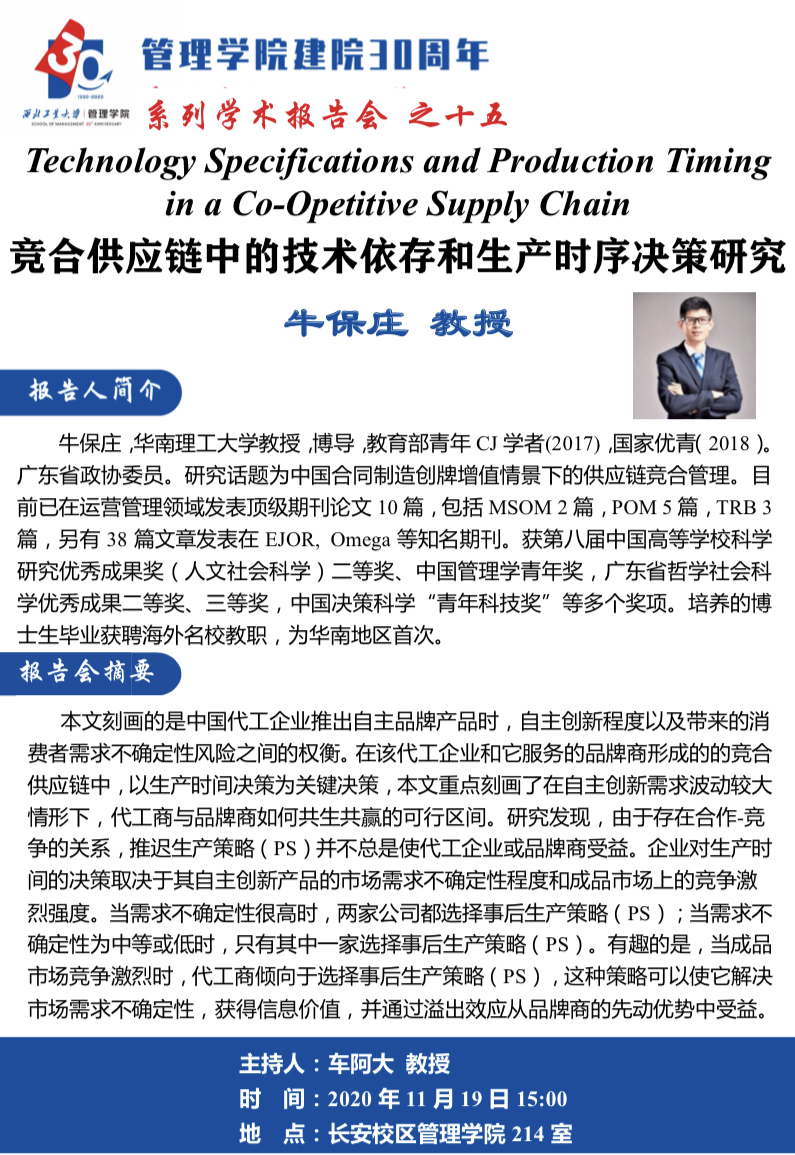 【漫岛动漫 建院30周年系列学术报告会之十五】竞合供应链中的技术依存和生产时序决策研究