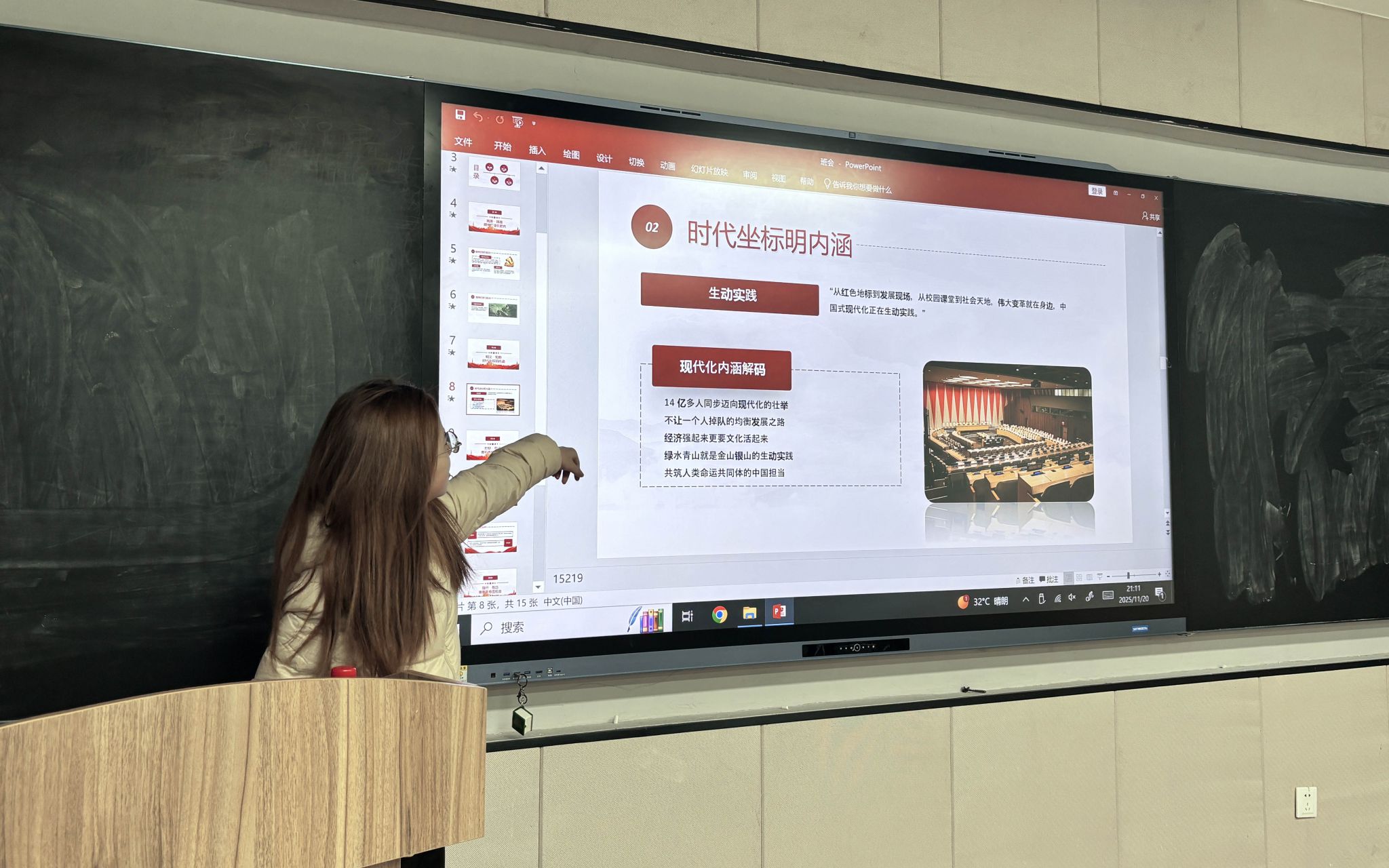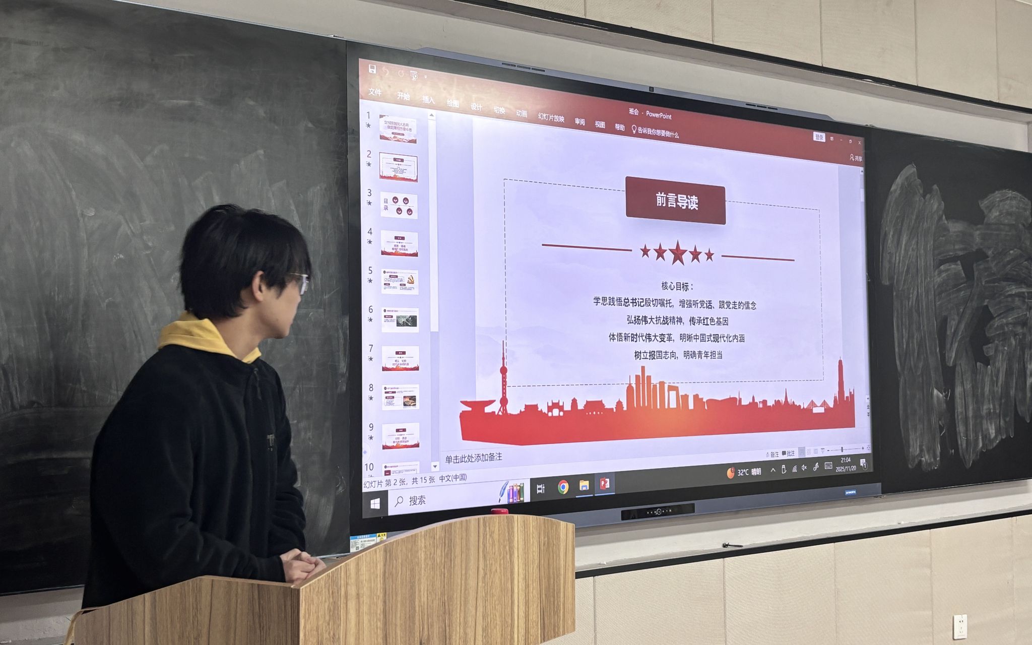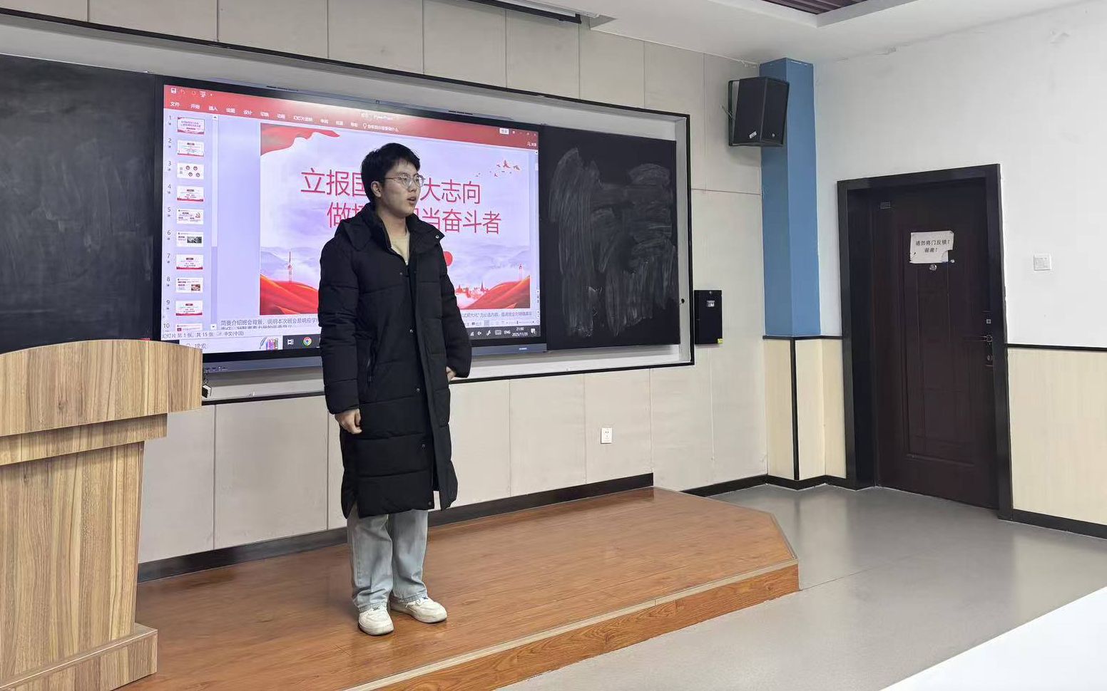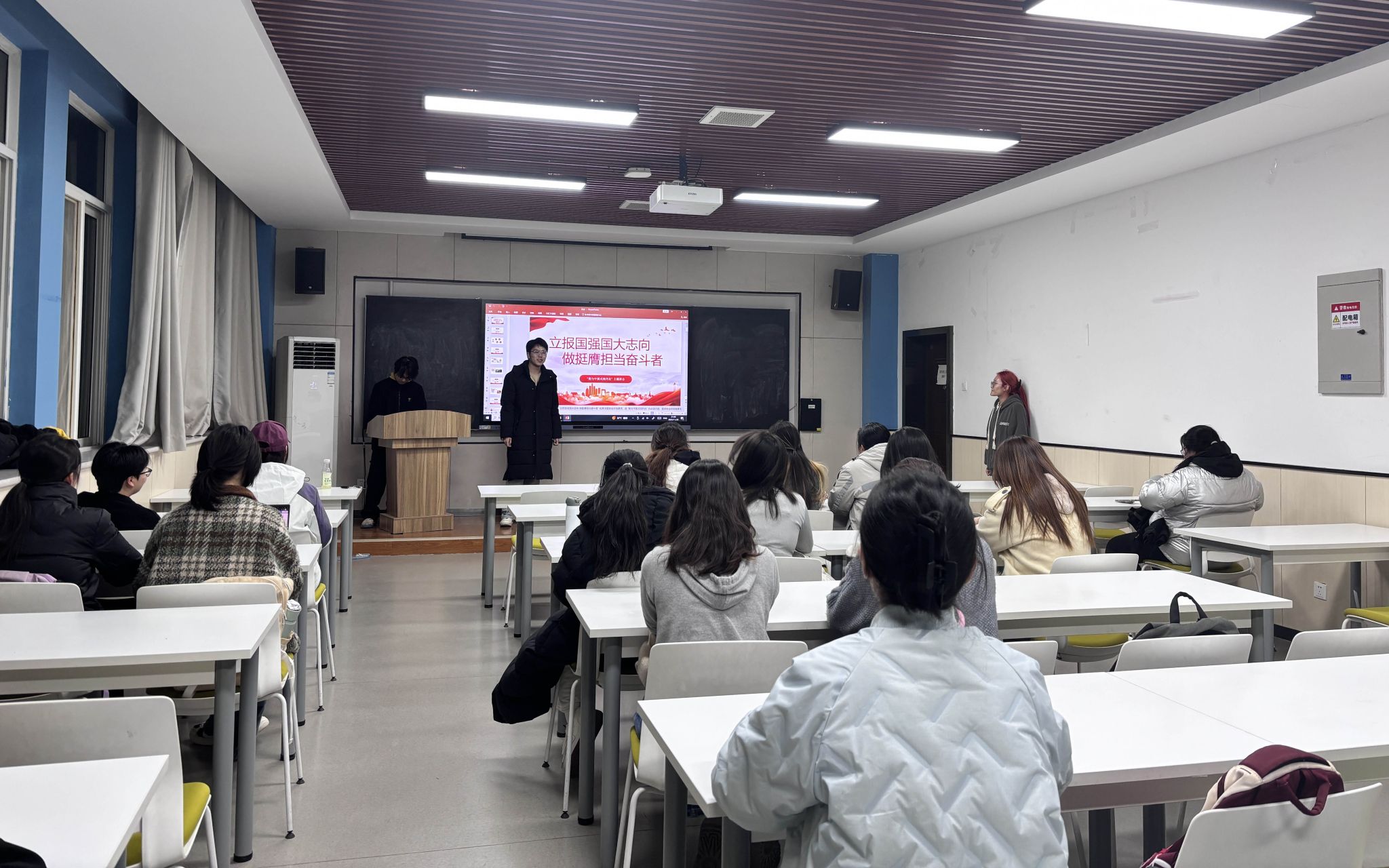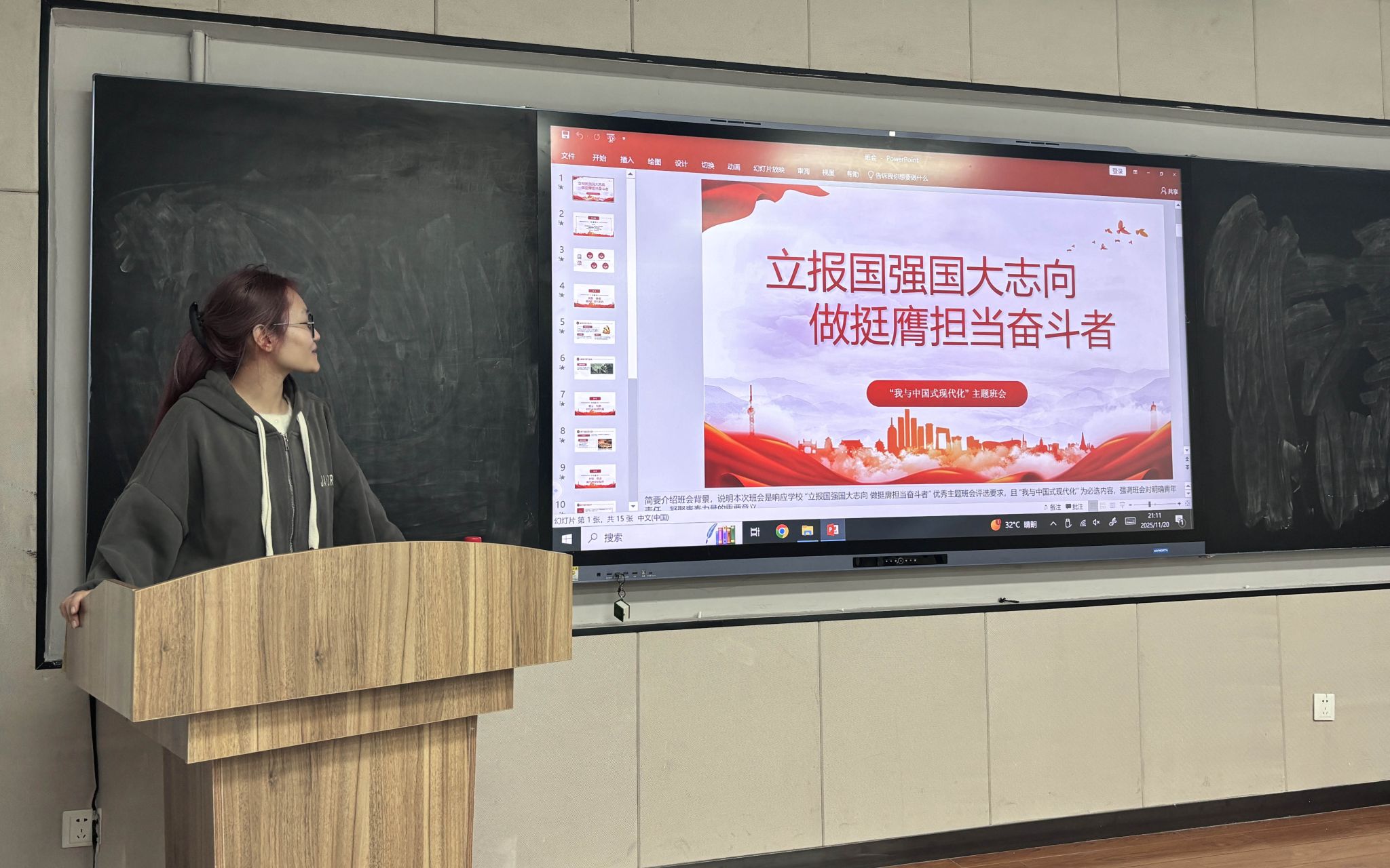 班会启幕,班长翟芸汝率先发声,强调学子需在中国式现代化坐标轴上锚定青春方位,以专业报国之志奠基昂扬班魂。学习委员张锐峰围绕“溯源·铸魂”“明义·知势”“对标·思进”“践行·致远”四大板块为经纬,重温了习近平总书记“自找苦吃”“做新时代好青年”殷切寄语,解析中国式现代化14亿人同步、生态优先等内涵,并通过嫦娥六号青年攻关、00后教师龙伟杰夺金等案例,展现青年担当,诠释“奋斗是青春最亮丽的底色”。