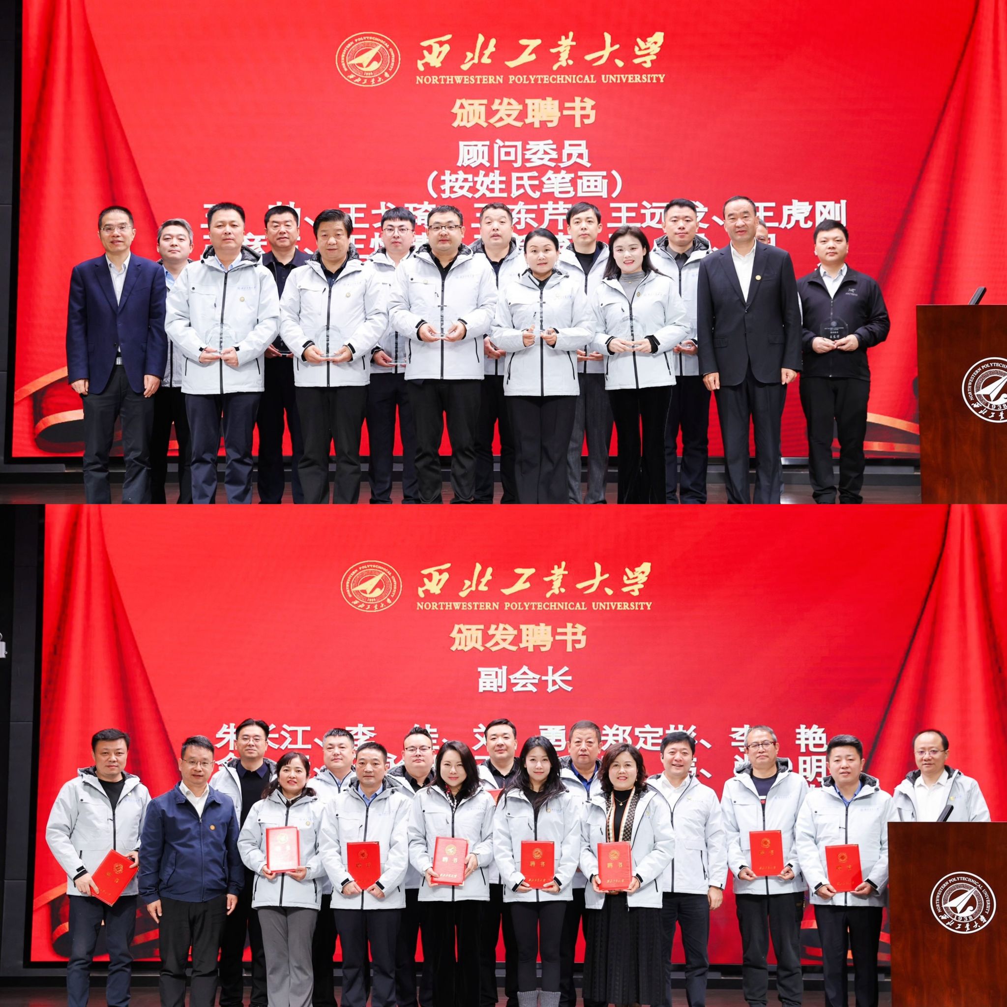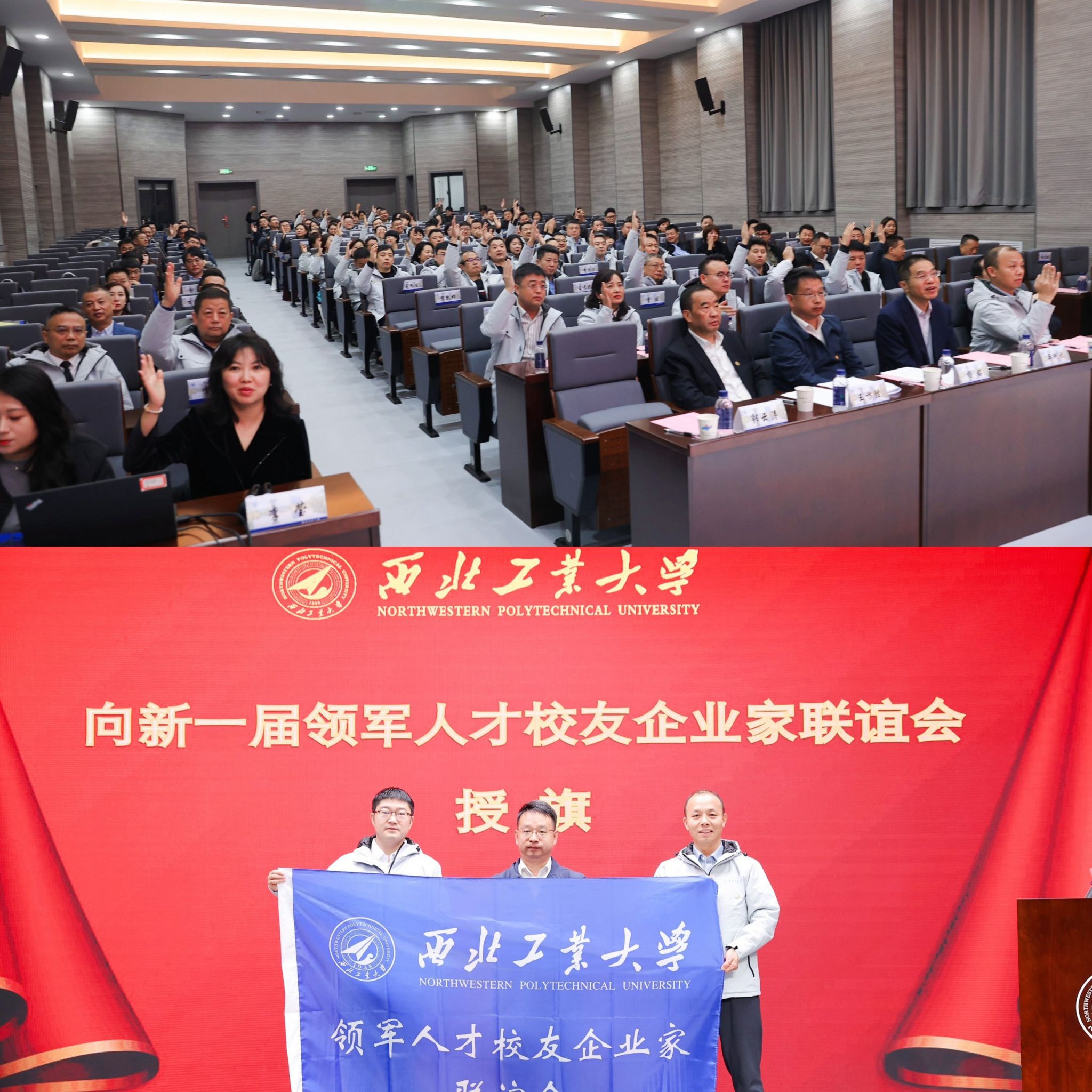 车阿大院长,西安校友会王方胜会长为新学员代表授班旗、佩戴校徽,秉承西工大校训弘扬校风,传承工匠精神和文化。