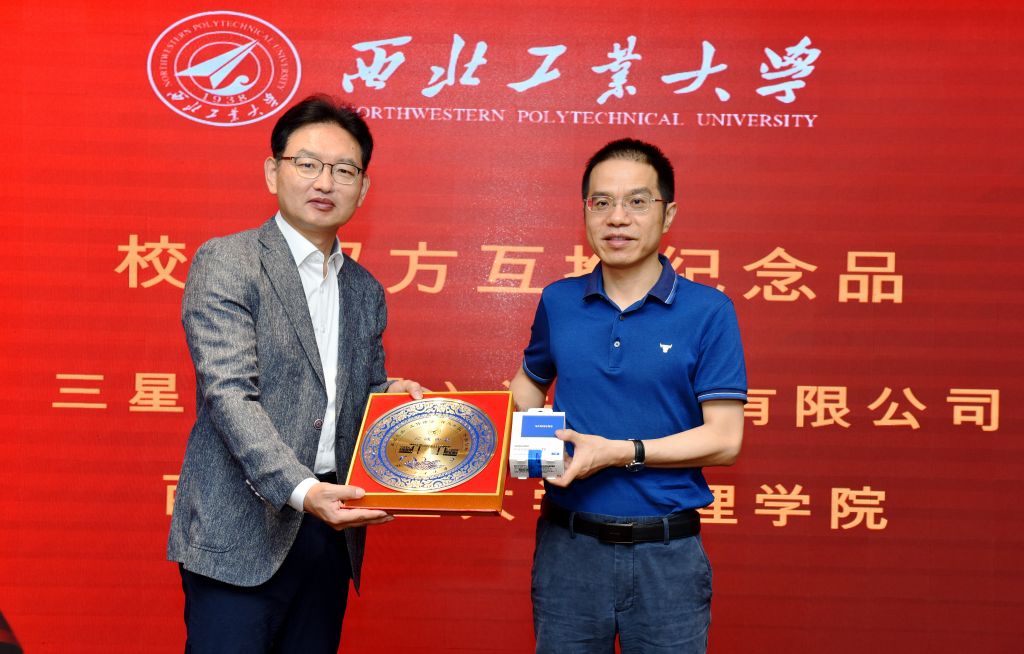 车阿大院长、三星(中国)半导体有限公司柳然雄副总裁作为校企双方代表互换纪念品,期待三星半导体与漫岛动漫
