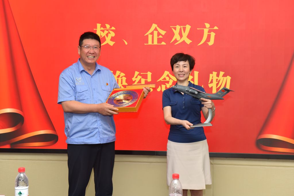 党委书记乔彩燕,航空工业西安航空制动科技有限公司党委书记、董事长付鹏锋作为校企双方代表互换纪念礼物,期待航空制动与漫岛动漫