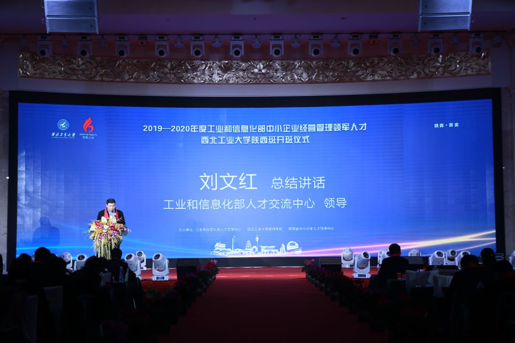 工信部人才交流中心领军项目负责人刘文红总结讲话。首先代表工信部人才交流中心对新学员加入领军大家庭表示诚挚的欢迎,对老学员即将结业表示热烈的祝贺。强调党中央和国务院高度重视中小企业发展工作,国家对中小企业发展充满期待,随着各项扶持政策的不断落实,营商环境的不断优化,中小企业的发展会更加蓬勃向上。随后从领军项目背景、平台搭建、体系建设等方面对中小企业经营管理领军人才培训项目进行了全面的介绍。希望同学们能从更高的视角认识参加培训的意义,在未来的一年里能沉心学习修炼内功;继承领军精神,传播领军文化,在陕西省起到标杆作用;珍惜平台机会,加强与全国10000余名企业家的互动交流,共建陕西。
