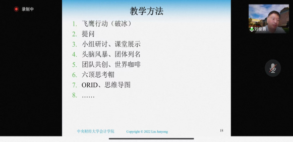 刘俊勇教授的分享围绕“什么是行动学习”、“教师如何在课堂中应用行动学习”、“教师如何在社会服务项目中应用行动学习”、“学院如何在人才发展中应用行动学习”四部分内容展开,他以《管理会计》课程作为切入点,细致而生动地介绍了他在行动学习方面多年的探索与实践过程与经验。刘教授将行动学习六个基本要素归纳为:1、项目、挑战、任务或问题;2、规模为4-8人的小组,想法各异;3、互动式的提问与倾听;4、指定策略与采取行动;5、学习承诺;6、行动学习教练(催化师),并详细介绍了将行动学习(Action Learning,AL)与云班课(MOSO)等云教学平台相结合的奥云教学法(ALMOSO),在此基础上提出7项行之有效的教学方法:1、飞鹰行动(破冰)2、提问;3、小组研讨、课堂展示;4、头脑风暴、团队列名;5、团队共创、世界咖啡;6、六项思考帽;7、ORID、思维导图。