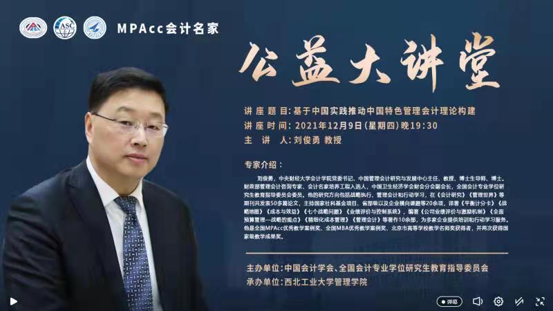 承办的“MPAcc会计名家公益大讲堂”通过线上直播方式顺利举行。本次讲座特邀全国会计专业学位研究生教育指导委员会委员、MPAcc会计名家、中央财经大学会计学院博士生导师刘俊勇教授主讲。讲座由漫岛动漫