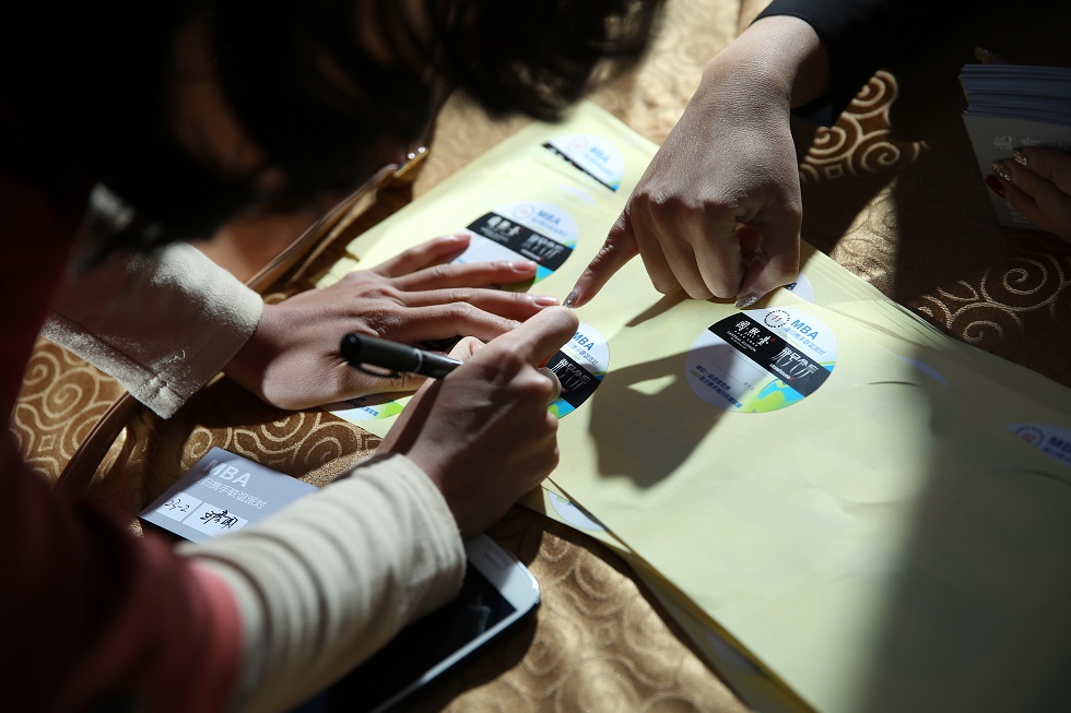 副院长吴振磊、MBA中心主任马晓强;长安大学发展研究中心主任蒲济生;以及西安市外国专家局副主任马思拓;陕西省侨商联合会及西安市侨商会、侨青委领导等。当晚,特邀嘉宾及学员们在入口处签到,贴上属于自己的标签,系上专属的金色丝带,将签到卡投到抽奖箱里,准备入场。
