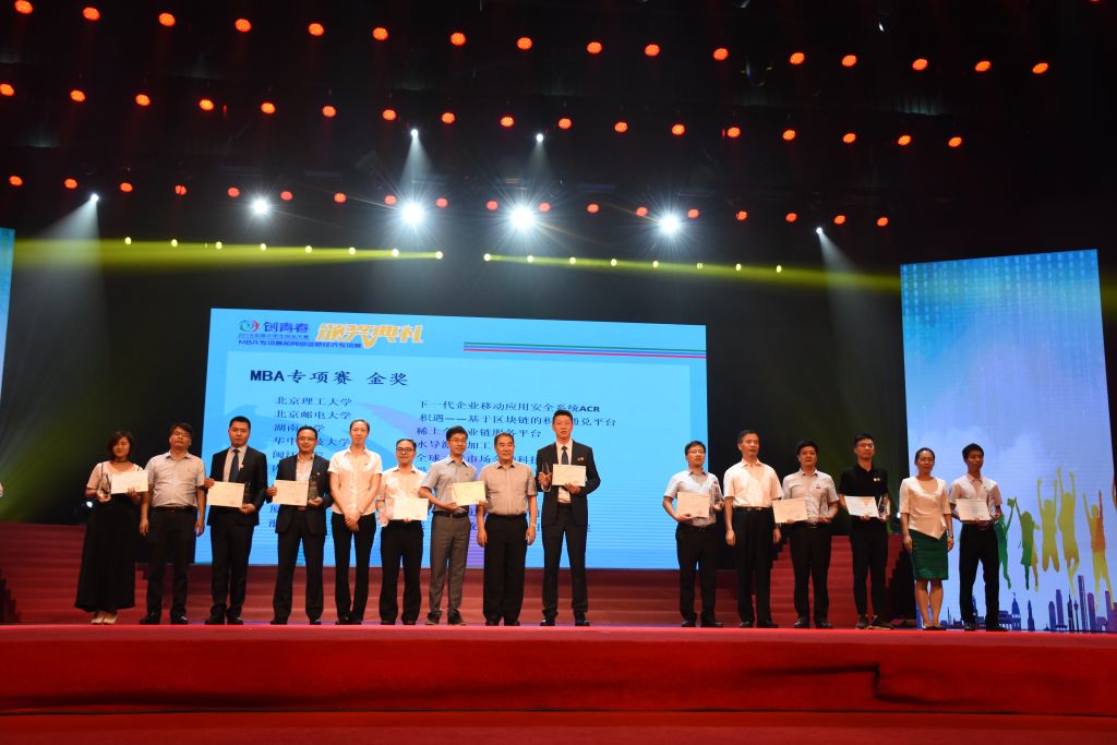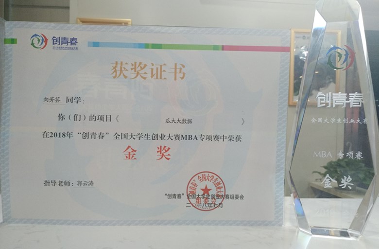 2018年7月12-15日,2018年“创青春”全国大学生创业大赛MBA专项赛和网络信息经济专项赛在浙江师范大学隆重举行。此次MBA专项赛来自全国100所知名高校参加,由我校MBA学员向芳芸、黄卫宏、张晓宇、马正、郭文浩组成的创业团队作品“瓜大大数据:遥感大数据产业的运用与服务”经过商业计划书评审、现场答辩、集中评议等环节获得全国金奖,我校也是西部地区唯一一所获得MBA专项赛全国金奖的高校。