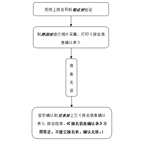 1.所有考生均应在规定时间内到报考点指定地方现场核对并确认本人网上报名信息,否则报名无效,报名信息经考生本人确认后一律不作修改,因考生填写错误引起的后果由本人自行承担,逾期不再补办。