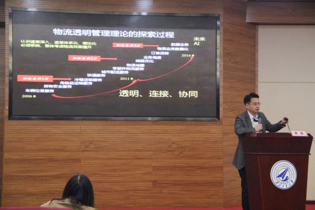 黄滨先生结合个人的创业经历,对未来物流供应链的发展趋势进行了深入剖析,阐述了数字化、产业互联网、新新人类、智能化等概念,同时提出了物流透明管理理论的探索过程、现实意义、供应链达人成长路径以及物流企业的价值等话题,引导学生对物流企业的现状和发展趋势进行思考。