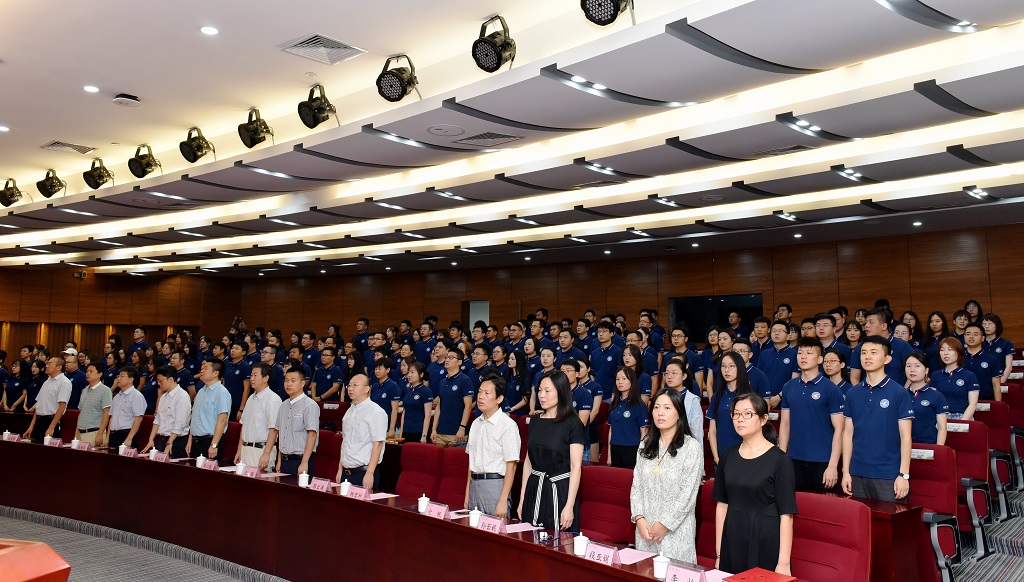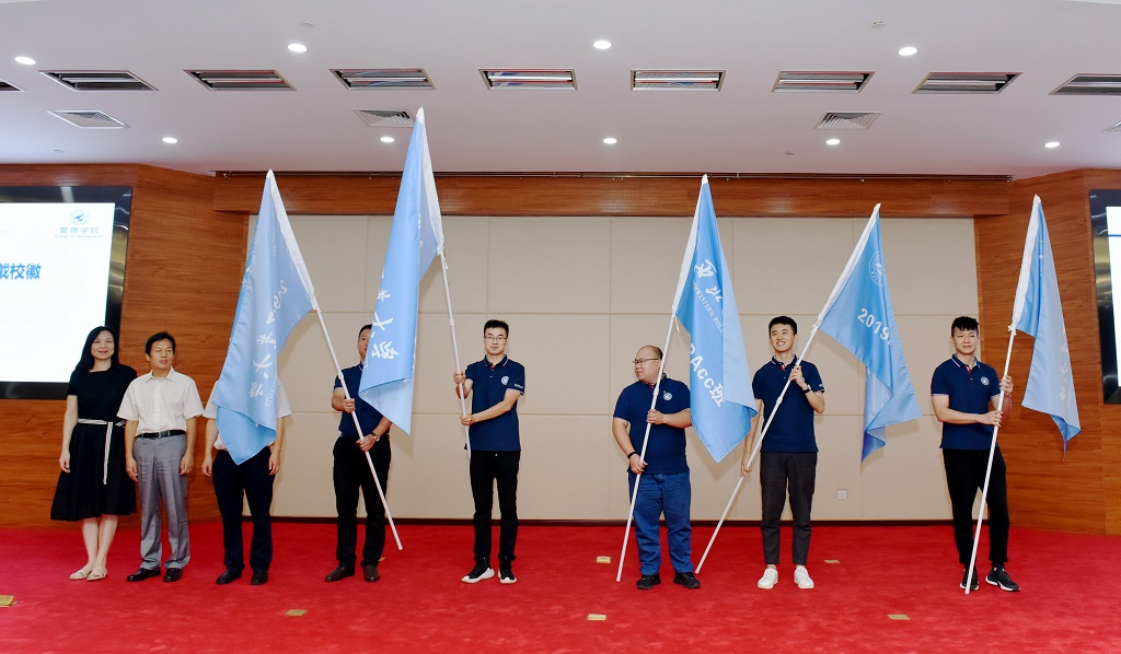 随后,郭云涛副院长、金帆主任和孙若妮副主任为9位新生代表佩戴校徽并授予班旗,隆重的授旗仪式将当天的典礼推向了高潮。