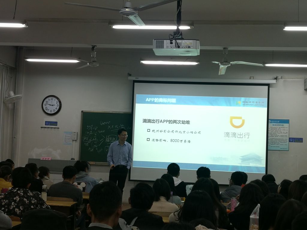 张律师结合知识产权实践,以某高校的技术成果转化案件开启本场讲座,分析高校技术成果转化中的知识产权出资问题,使同学们快速建立了知识产权的重要性意识。随后,张律师具体以“滴滴出行”APP 相关各方涉及到的“基于移动终端的拼车服务系统及方法”专利案件、西电捷通诉索尼中国公司和苹果公司案件为例,讲解了互联网时代企业运营中的知识产权问题,使法律知识变得生动形象,现场氛围轻松活泼。他分析微信公众号、手机应用软件、网络域名以及游戏名称等热门领域的商标问题,并通过解读经典案例,阐述了商标在生活中的应用;他细致讲解了“专利与专利产品的区别”、“专利权与著作权的区别”等核心知识点,让同学们对专利权有了更清晰的认识。