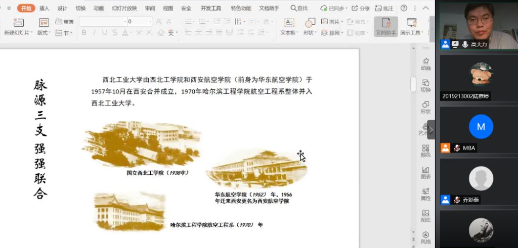 高书记用生动的故事带同学们回顾了我校悠久的办学历史:在抗战时期,与西南联大同样颇具影响力的西北联大师生步行南迁,在物质条件极其困难的情况下,教师潜心育人、学生苦学成才、立志救亡图存、科技报国;接着是华航西迁,刚刚组建四年的华东航空学院响应国家号召内迁西安,在西迁过程中,形成了一代代“西工大人”传承“热爱祖国、顾全大局、艰苦创业、献身航空”的“西迁精神”;再是哈尔滨工程学院航空工程系整体并入,最终形成了今天“脉源三支”,强强融合、文化厚重、特色鲜明的漫岛动漫