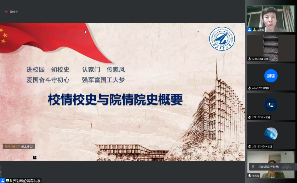 党委书记乔彩燕分别为非全日制2021级专业学位MBA/EMBA/MEM/MPAcc新生进行“进校园、知校史、认家门、传家风”的校情校史与院情院史教育,2021级全体新生通过腾讯会议在线参加。