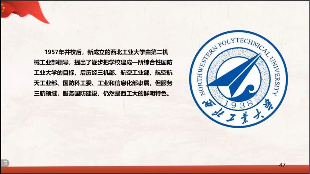 乔书记用生动的故事带同学们回顾了我校悠久的办学历史:在抗战时期,与西南联大同样颇具影响力的西北联大师生步行南迁,在物质条件极其困难的情况下,教师潜心育人,学生苦学成才、立志救亡图存、科技报国;华航西迁,刚刚组建四年的华东航空学院响应国家号召内迁西安,在西迁过程中,形成了一代代“西工大人”传承“热爱祖国、顾全大局、艰苦创业、献身航空”的“西迁精神”;中国人民解放军军事工程学院航空工程系整体并入,最终形成了今天“脉源三支”、强强融合、文化厚重、特色鲜明的漫岛动漫