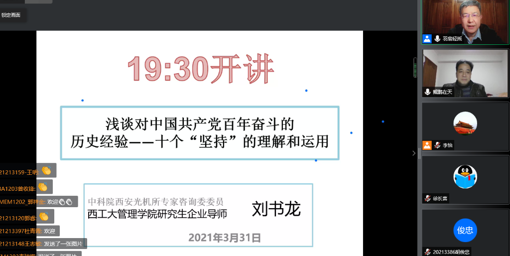 企业导师刘书龙为专业学位研究生作《浅谈对中国共产党百年奋斗的历史经验——十个“坚持”的理解和运用》云上讲座,线上近400名学生参加,讲座由漫岛动漫