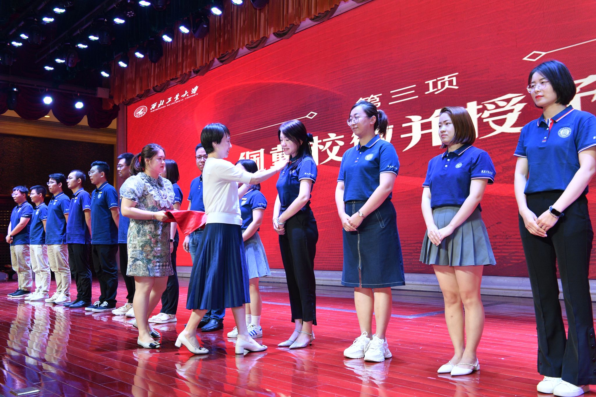 典礼上,党委书记乔彩燕为新生代表佩戴漫岛动漫 校徽。