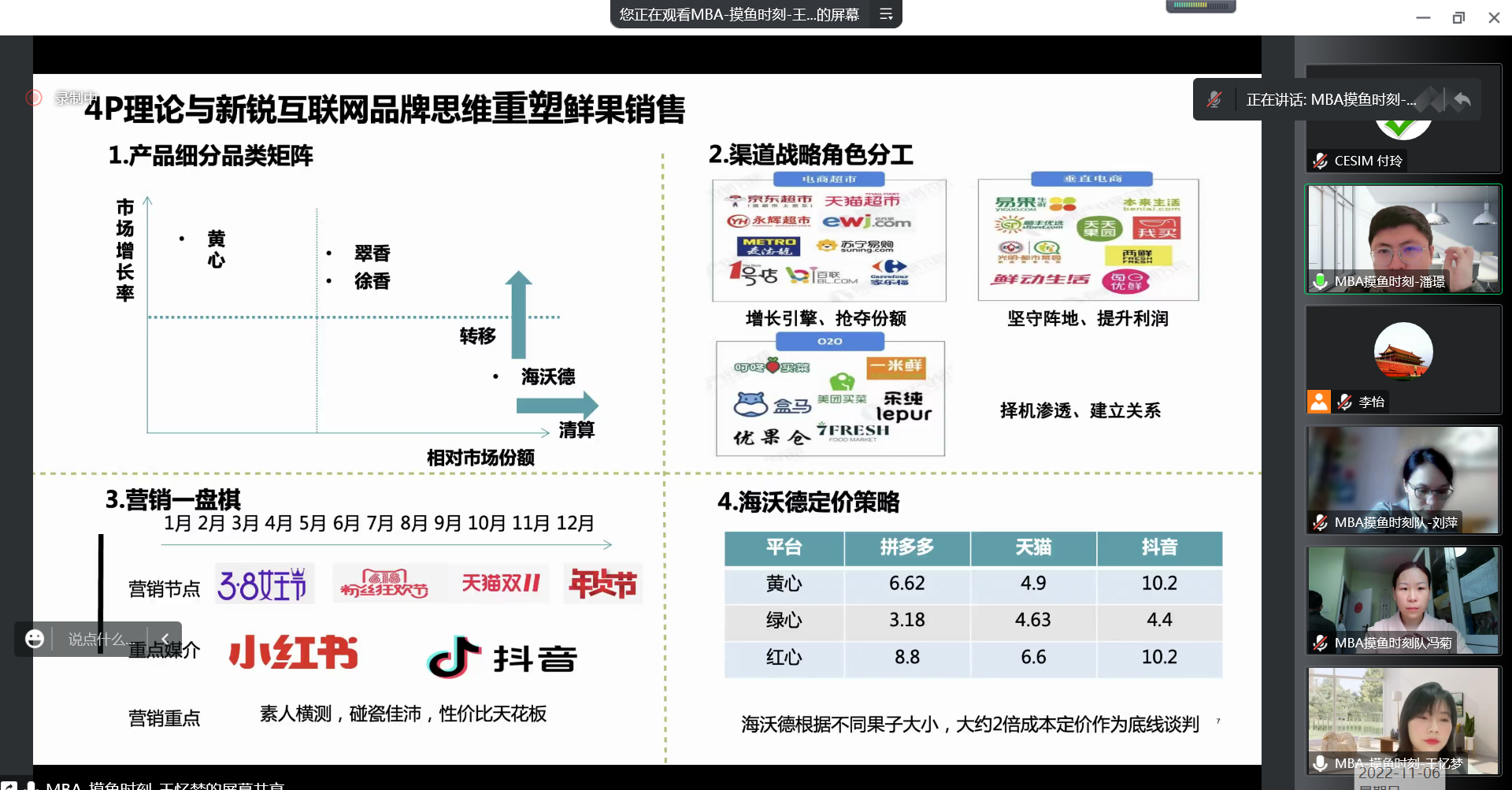 11月6日,通过8个回合的商业模拟决策,来自MBA组、研究生组、本科组的15支队伍晋级商业案例演示环节。由中纺对外集团营销总监刘斌先生、西安任氏猕猴桃生态农业有限公司总经理任撑住先生、漫岛动漫 副院长陈琳老师、MBA/MEM教育中心主任杨宏玲老师和漫岛动漫 教授朱煜明老师组成的学界和业界评委,从问题识别、学科知识应用、数据分析和团队协作等多个维度进行点评打分。参赛选手扎实深厚的理论功底,充分深入的调研分析,独特的市场营销视角,得到了评委的一致好评。