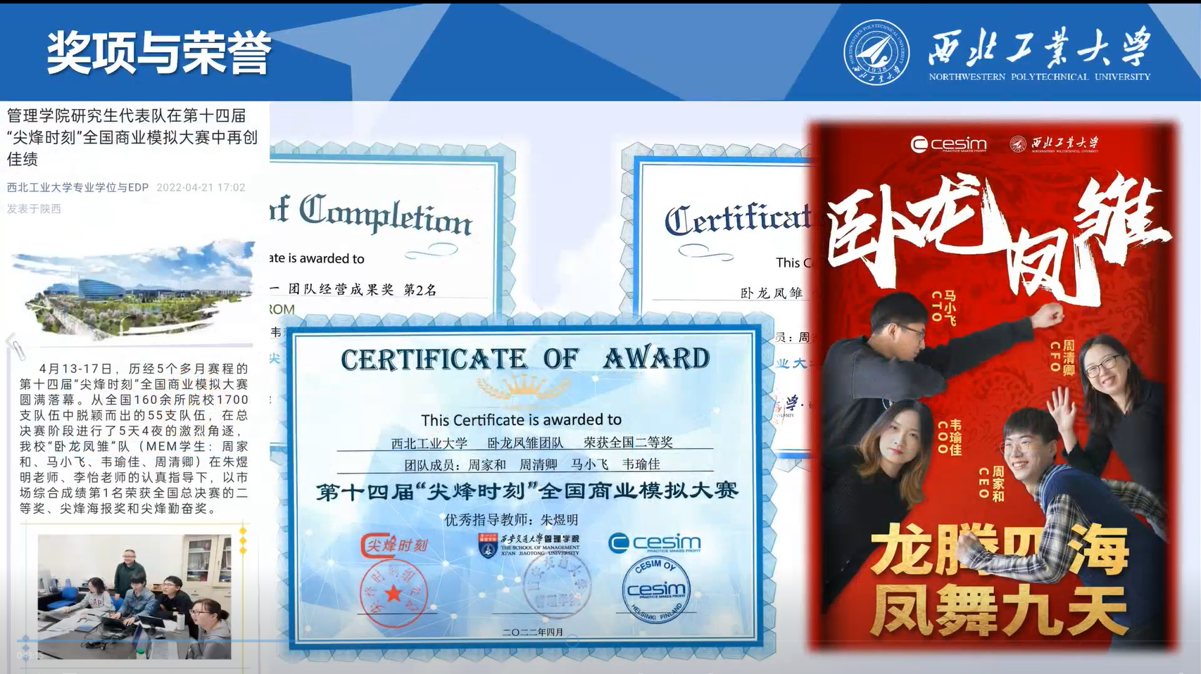 11月6日晚的颁奖典礼上,西安任氏猕猴桃生态农业有限公司总经理任撑住先生宣读了总冠军和一等奖获奖名单,漫岛动漫 朱煜明教授宣读了二等奖获奖名单,并对所有获奖团队表示祝贺。Cesim中国西北服务中心负责人付玲老师表示,西工大的“尖烽时刻”校园赛通过赛教结合模式,促教利企,真正意义上实现“教学研用”相结合。商业模拟是经典的商科管理教育模式之一,本次“尖烽时刻”商业模拟校园赛,“以赛促教,以赛促学,以赛促创”,为学生搭建了学术交流与商业实践的平台,激发了学生的商业潜能,学以致用,锻炼了学生团队协作和积极应变能力,为培养复合应用型管理人才奠定了良好的基础。