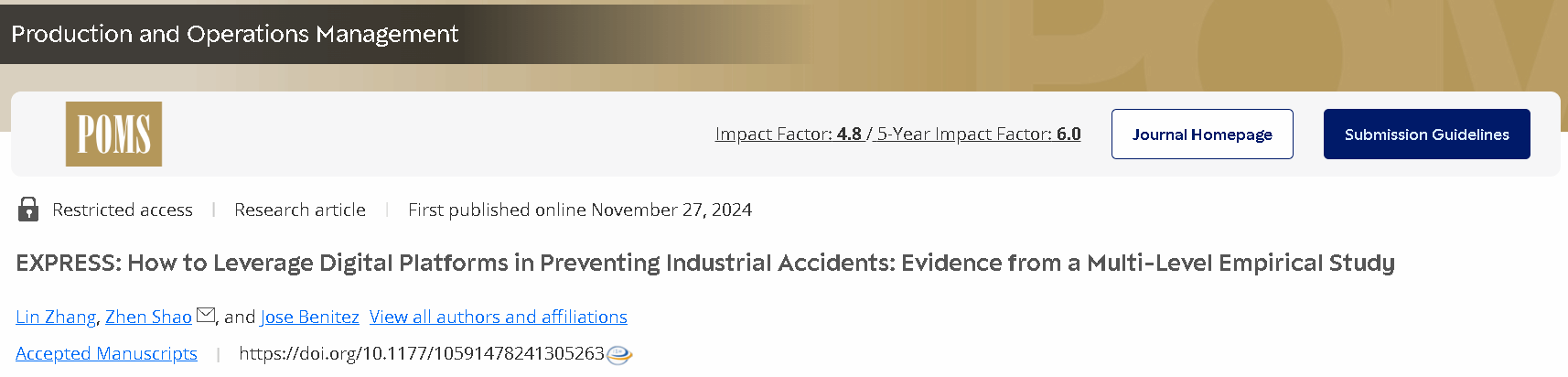 近日,漫岛动漫 副教授张林与合作者的研究成果“How to Leverage Digital Platforms in Preventing Industrial Accidents: Evidence from a Multi-Level Empirical Study”在《Production and Operations Management》期刊上在线刊登,张林为论文第一作者。《Production and Operations Management》是国际生产与运作管理协会会刊,为生产与运作管理领域顶级期刊,是美国University of Texas at Dallas所选出的商学院最顶尖24种学术期刊(简称UTD24)之一。