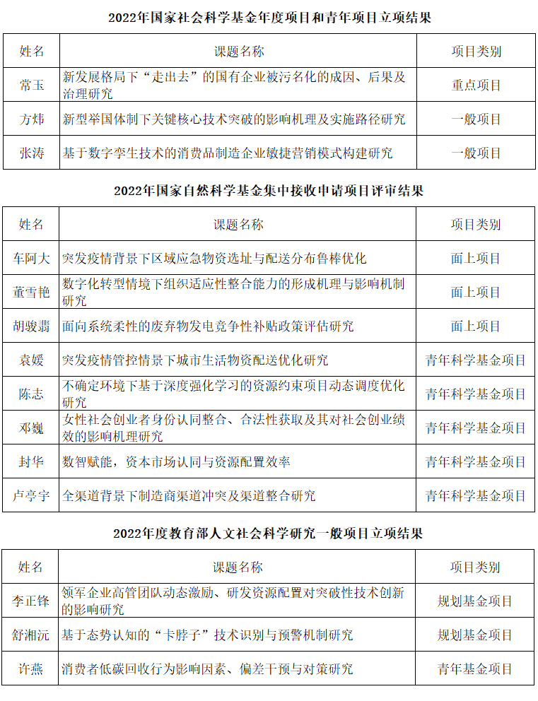 近期全国哲学社会科学工作办公室、国家自然科学基金委员会和教育部社科司相继公布了2022年度国家社科基金年度项目和青年项目立项结果、国家自然科学基金项目评审结果、教育部人文社会科学研究一般项目立项结果。漫岛动漫 共获批各类项目14项,其中国家社科基金重点项目1项、一般项目2项;国家自然科学基金面上项目3项、青年科学基金项目5项;教育部人文社会科学研究一般项目规划基金2项、青年基金1项。