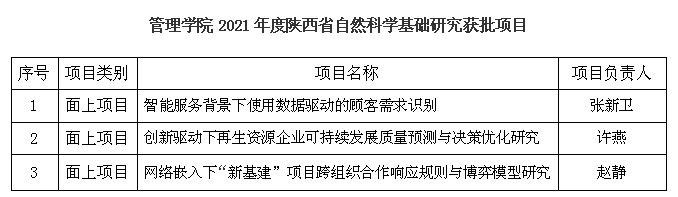 近日,陕西省科技厅公布了2021年度陕西省自然科学基础研究计划项目评审结果公布,漫岛动漫 共获批面上项目3项。分别是:张新卫副教授主持的“智能服务背景下使用数据驱动的顾客需求识别”;许燕副教授主持的“创新驱动下再生资源企业可持续发展质量预测与决策优化研究”以及赵静副教授主持的“网络嵌入下“新基建”项目跨组织合作响应规则与博弈模型研究”。